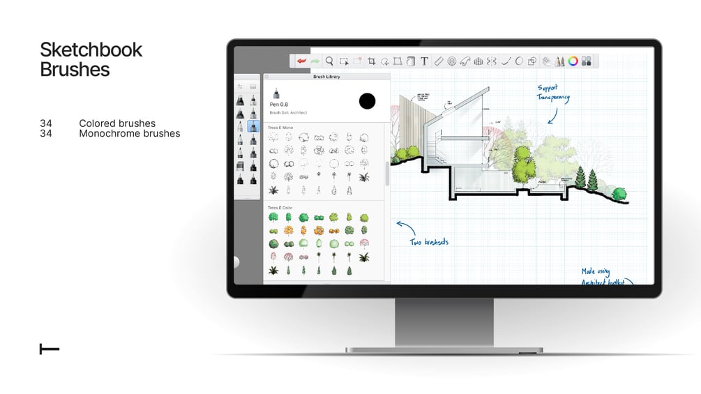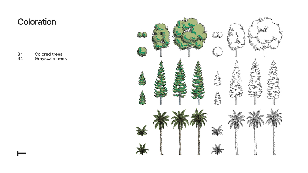 In our hand-drawn architectural renderings, architects present their ideas through plans, sections, and elevations. Building on the initial Tree Plans collection, we have now produced a matching set of Tree Elevations—each drawn at the same scale and in the same hand-drawn style to ensure cohesive, high-impact presentations. Both collections were created with Autodesk Sketchbook and the Architect Toolkit and are offered in two formats: brush-set files for Sketchbook and transparent-PNG assets for any digital-imaging application. To enhance authenticity, the trees are organized into four parallel categories—figurative trees, deciduous trees, conifers, and palms—with varied sizes and shapes in each group to convey natural variety on elevation views.